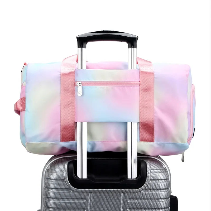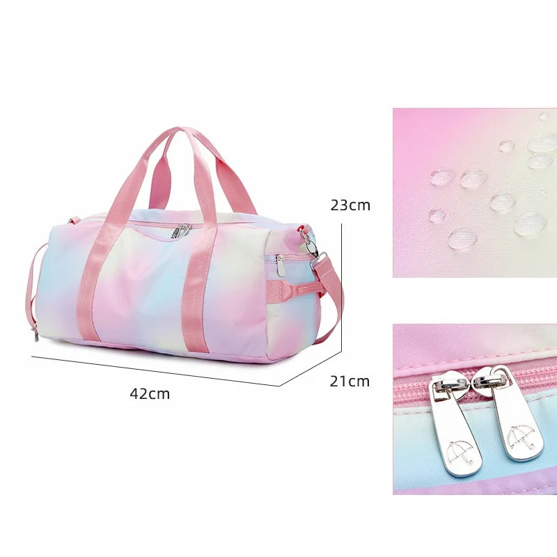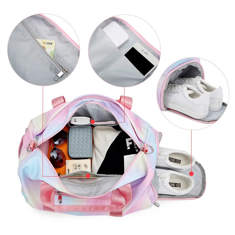 Description:Stay organized and stylish on the go with this large capacity sports bag featuring a separate shoe bag. Perfect for travel, gym, or everyday use.Features: Waterproof design for protection in all conditions Rainbow print adds a fun and vibrant touch Includes a separate shoe bag for convenience Spacious main compartment...