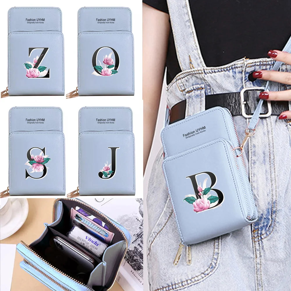 This stylish PU leather mobile phone bag doubles as a wallet with a touch screen cell phone pack. Ideal for women, it features a trendy design with 26 letter prints. Perfect as a shoulder bag for everyday use.