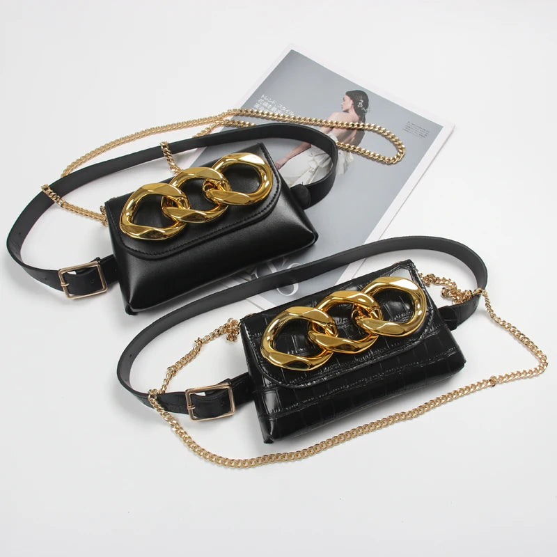 Stay stylish and hands-free with this PU leather waist pack that features a decorative chain. The waist belt is adjustable for a comfortable fit.