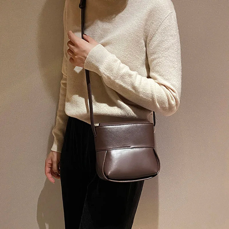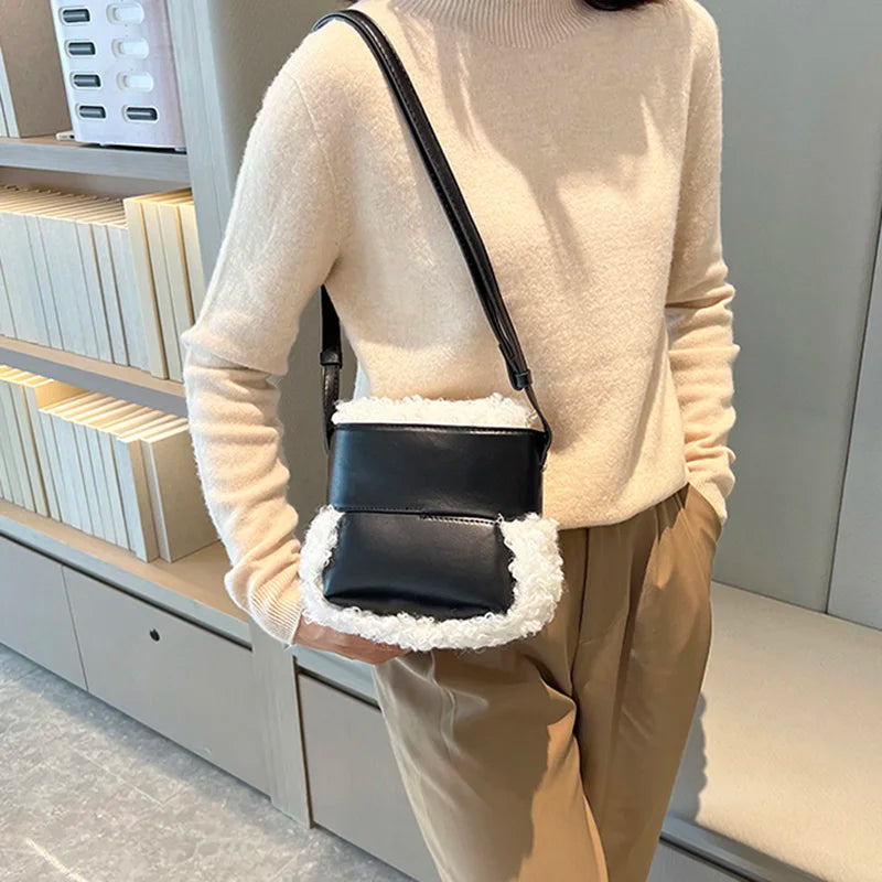 Stay stylish and chic with this small bucket bag featuring faux lambswool and soft leather. Perfect for the winter season, it's a must-have for any fashion-conscious woman.
