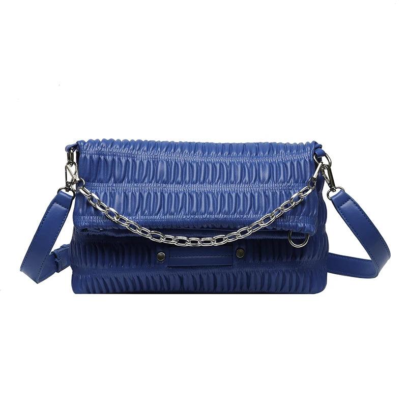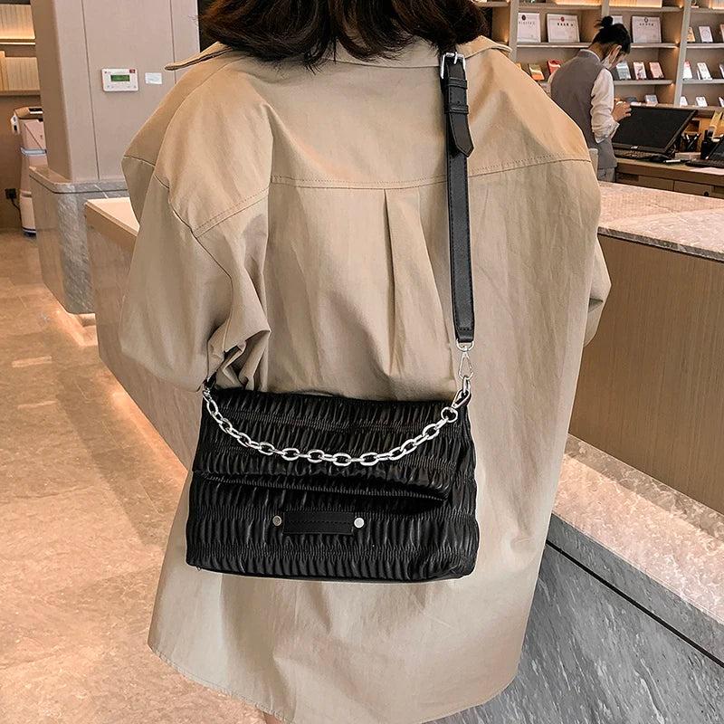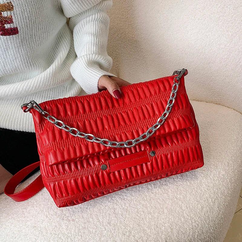 Stay stylish with this underarm bag made of high-quality PU leather. It features a chain strap and a fold-over design, perfect for any winter outfit. Available in various colors.