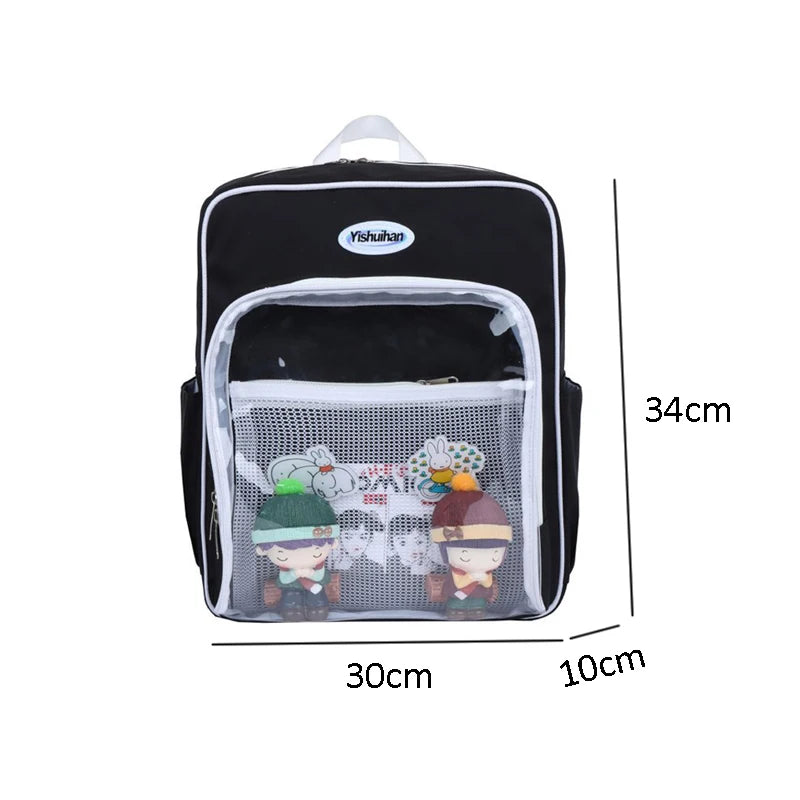 This fashionable women's backpack features a transparent pocket for displaying your favorite items. Ideal for teenage girls and students.