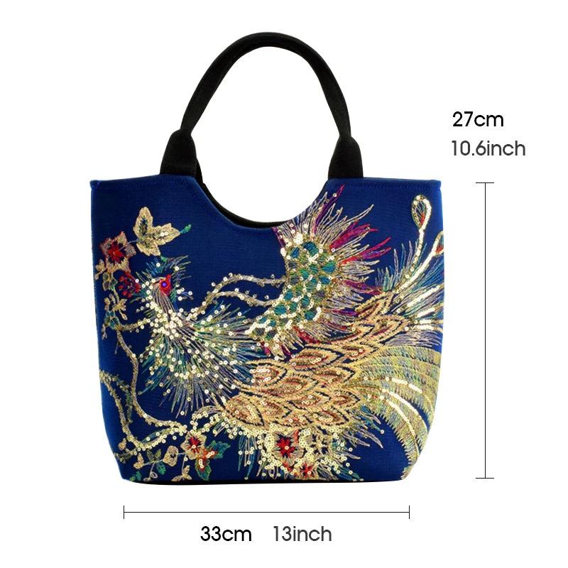 Women Bag Hand Embroidery Sequins Peacock Tote Bags Large Capacity
