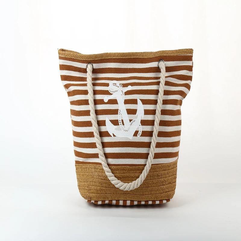 This stylish beach bag is made of durable canvas material, perfect for carrying all your essentials for holiday shopping or traveling. Features a large size, comfortable rope handles, and a nautical anchor pattern design.