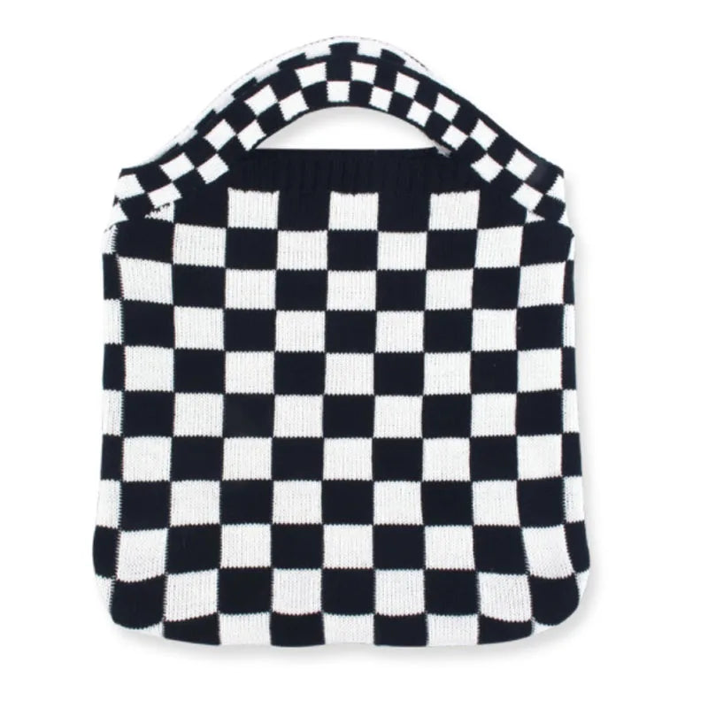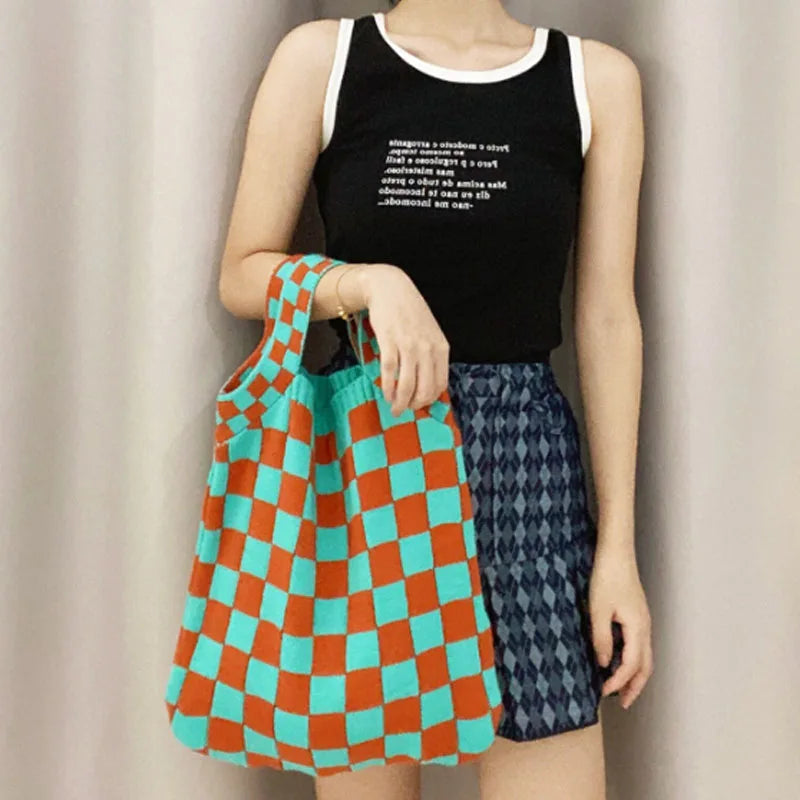 Women Checkered Shoulder Bag Woolen Knitted Clash Tote Bag