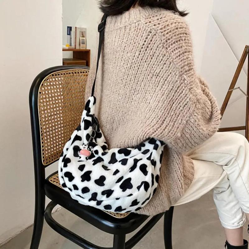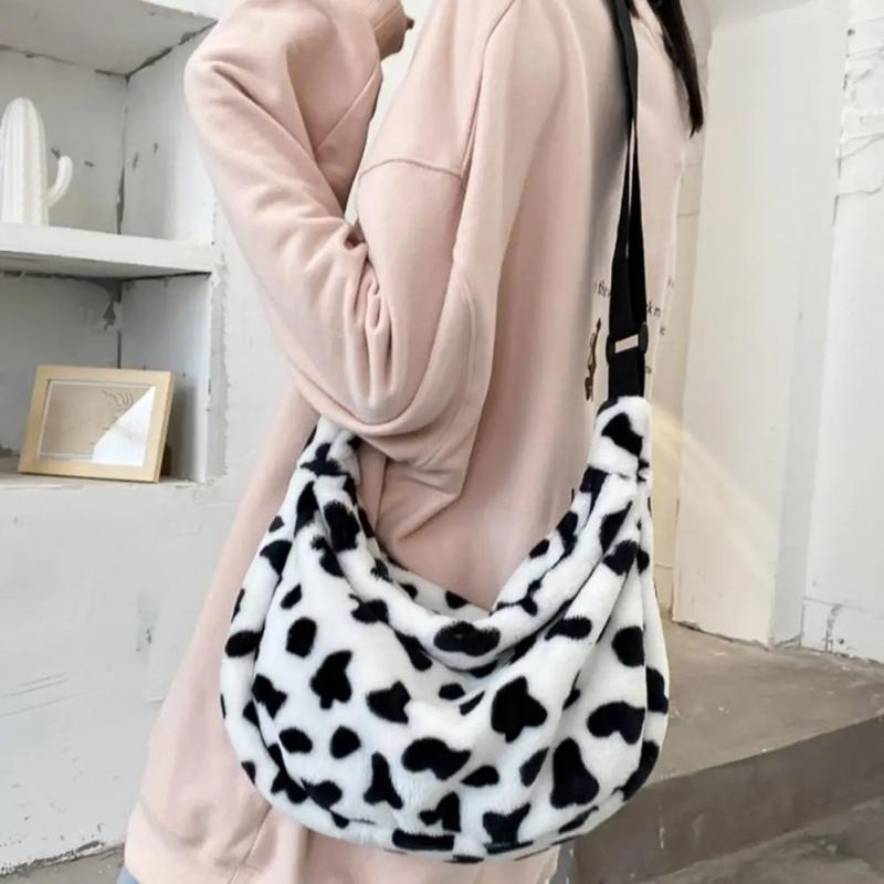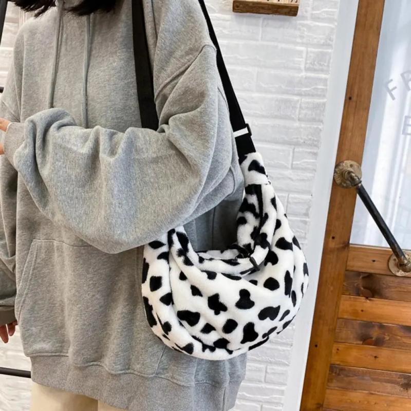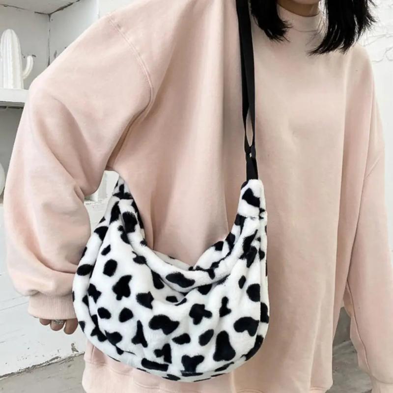 Women Cow Pattern Shoulder Bag Large Capacity Plush Zipper Crossbody Pouch