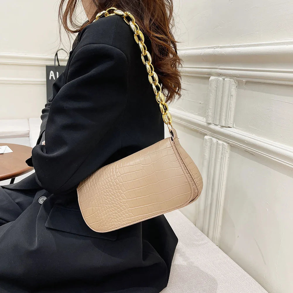 This PU leather underarm bag features a luxurious crocodile pattern design, making it a stylish accessory for any outfit. The chain shoulder strap adds a touch of elegance, perfect for business or evening events.