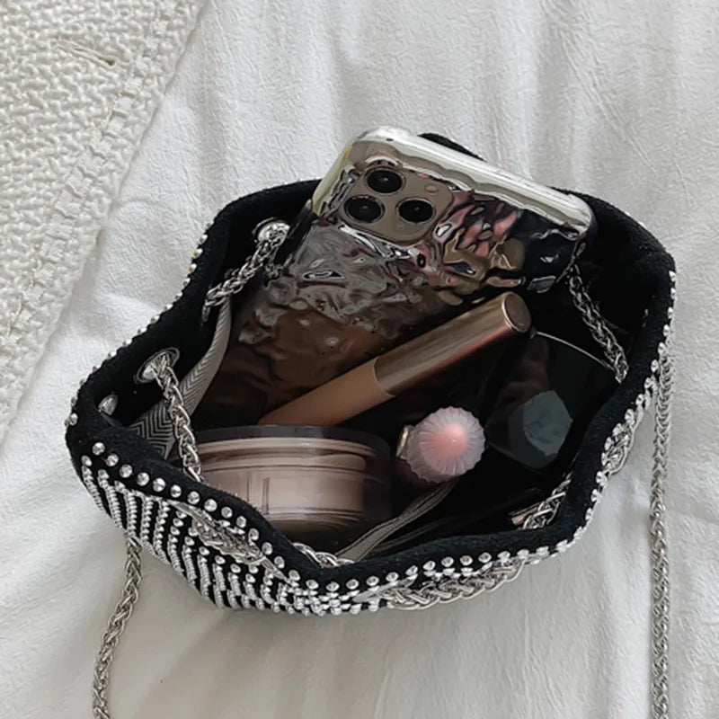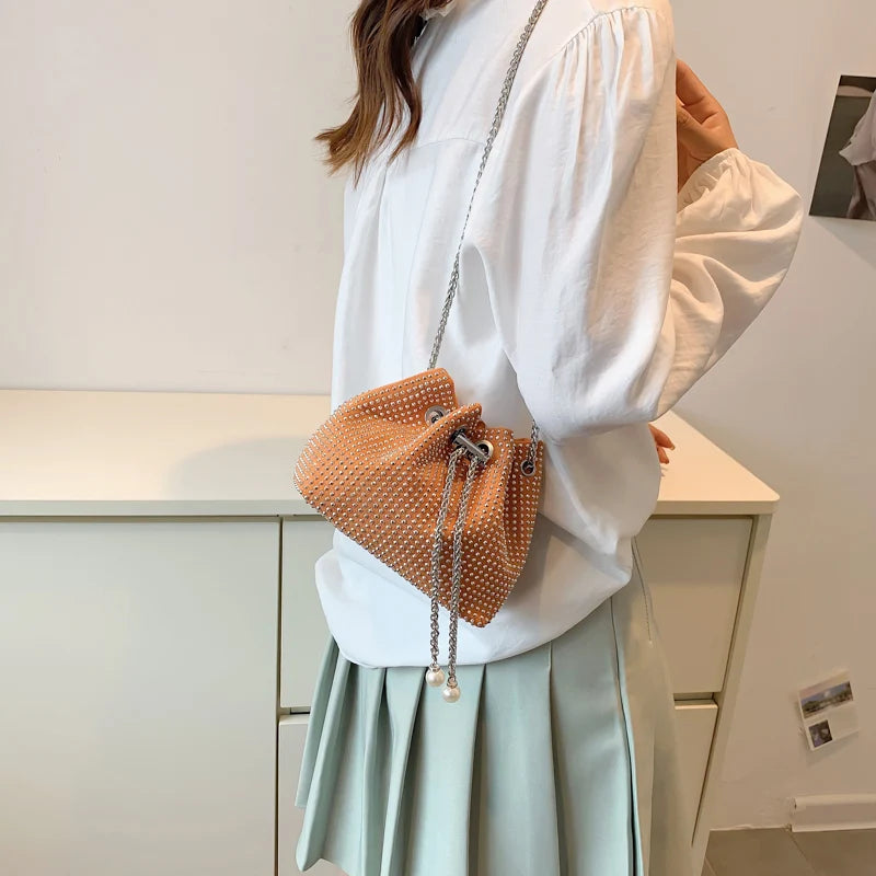 This stylish bucket bag features a drawstring closure and sparkling diamond design, perfect for everyday use.
