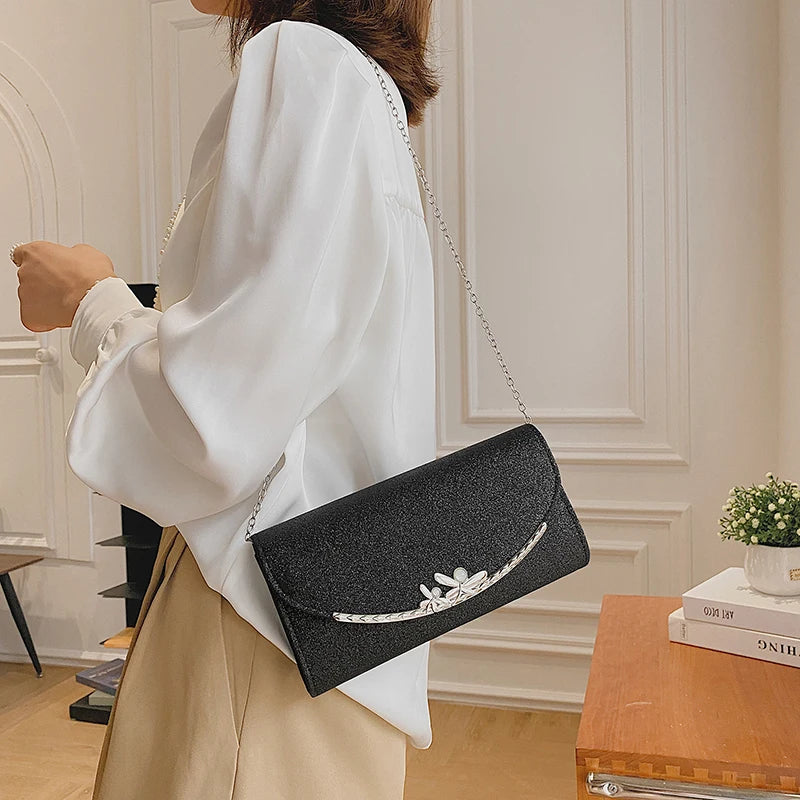 Elegant and stylish women's evening clutch bag with floral design perfect for weddings, parties, banquets, or any special occasion. Features a sequin shoulder strap for easy carrying.