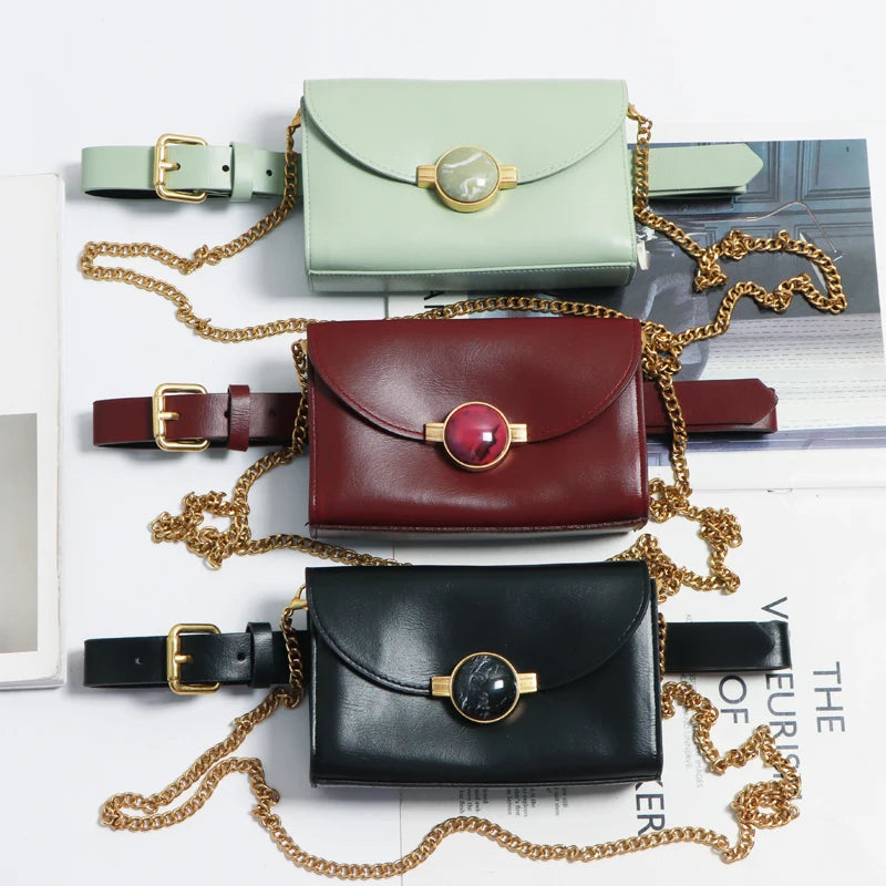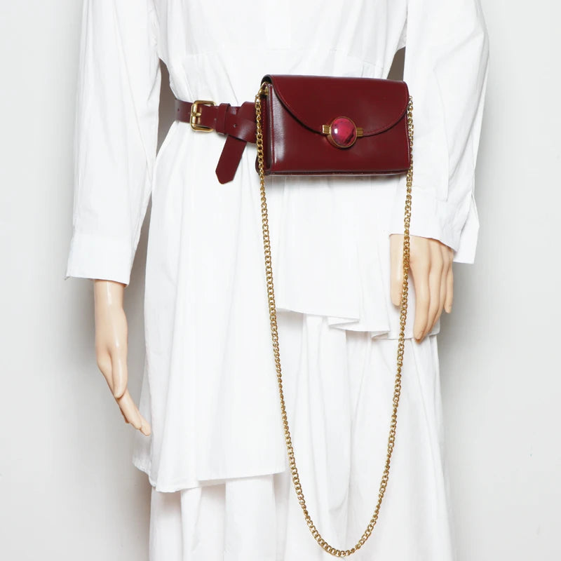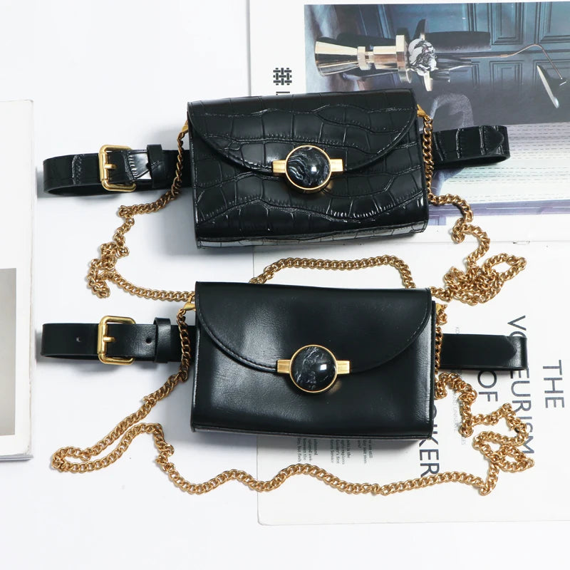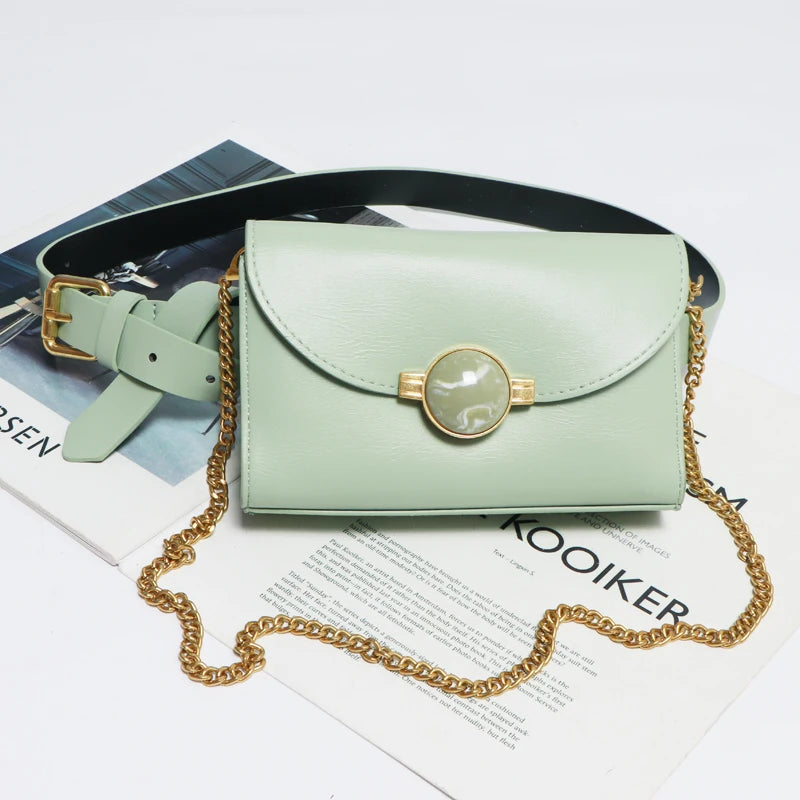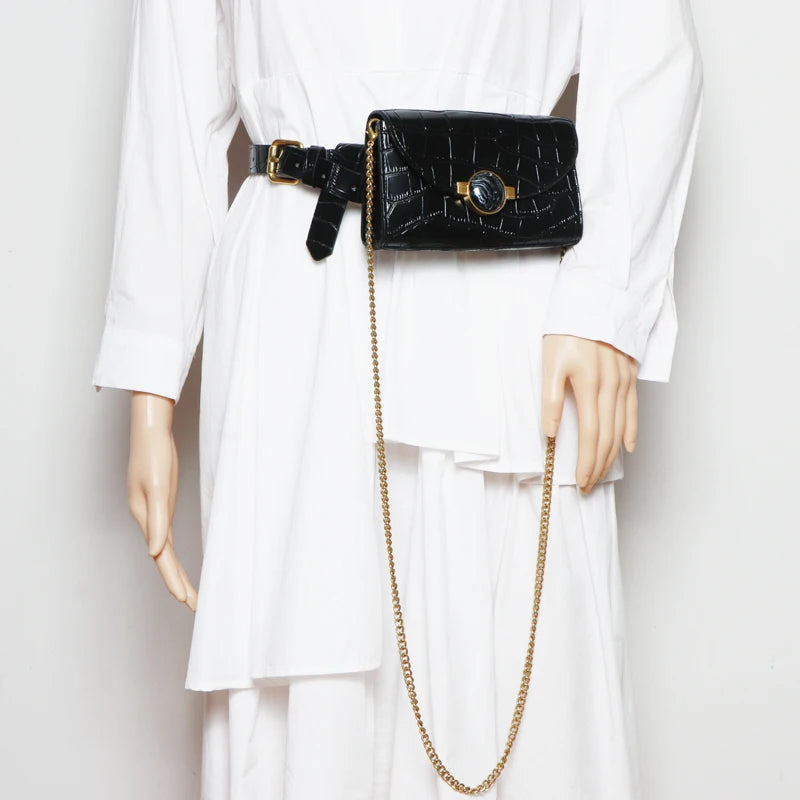 Stay organized and stylish with this versatile fanny pack that can be worn around your waist or as a crossbody bag. Made of high-quality PU leather, it features a detachable chain for added flair.