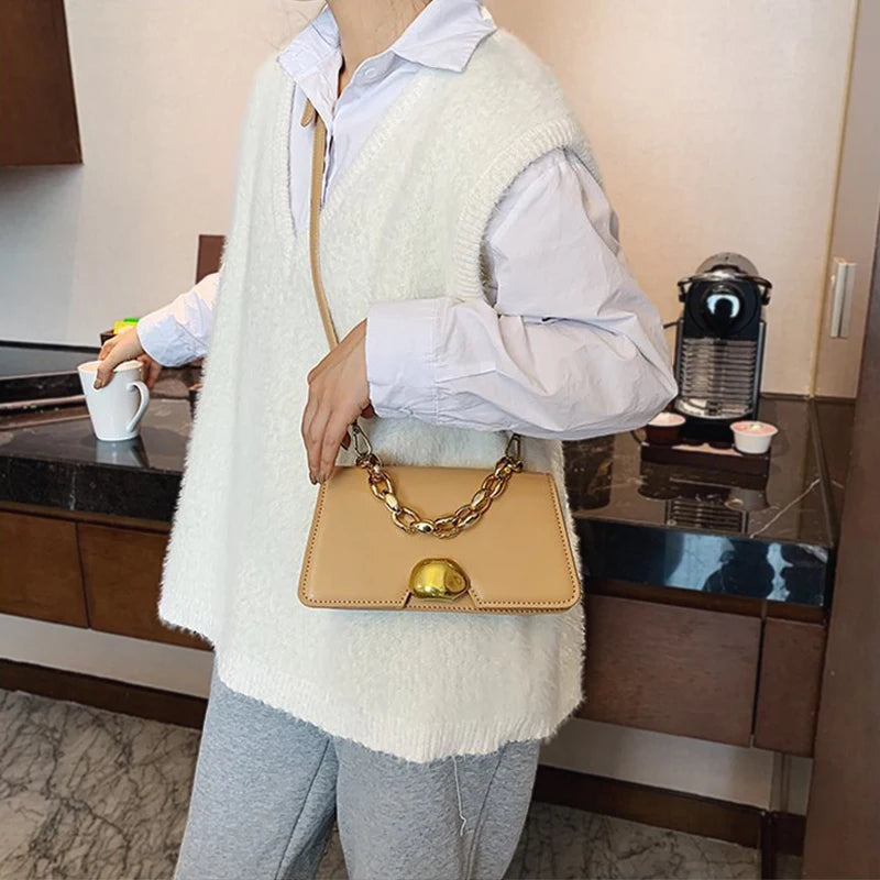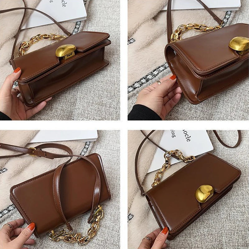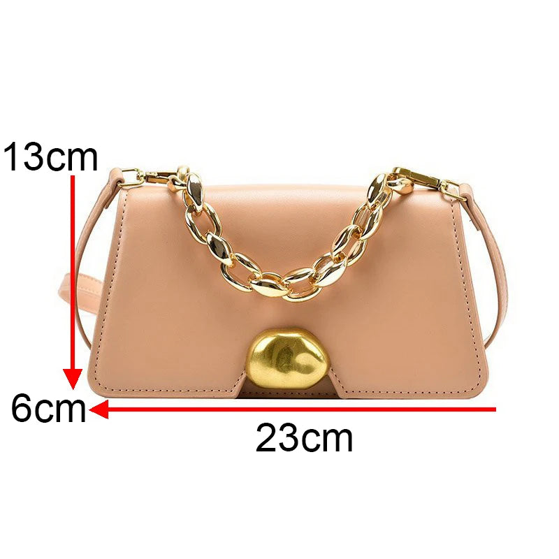 This stylish shoulder bag is made of high-quality PU leather, featuring a solid color design. It has a lock closure and a small flap for a chic look. The bag is perfect for daily use and can hold your essentials with ease.
