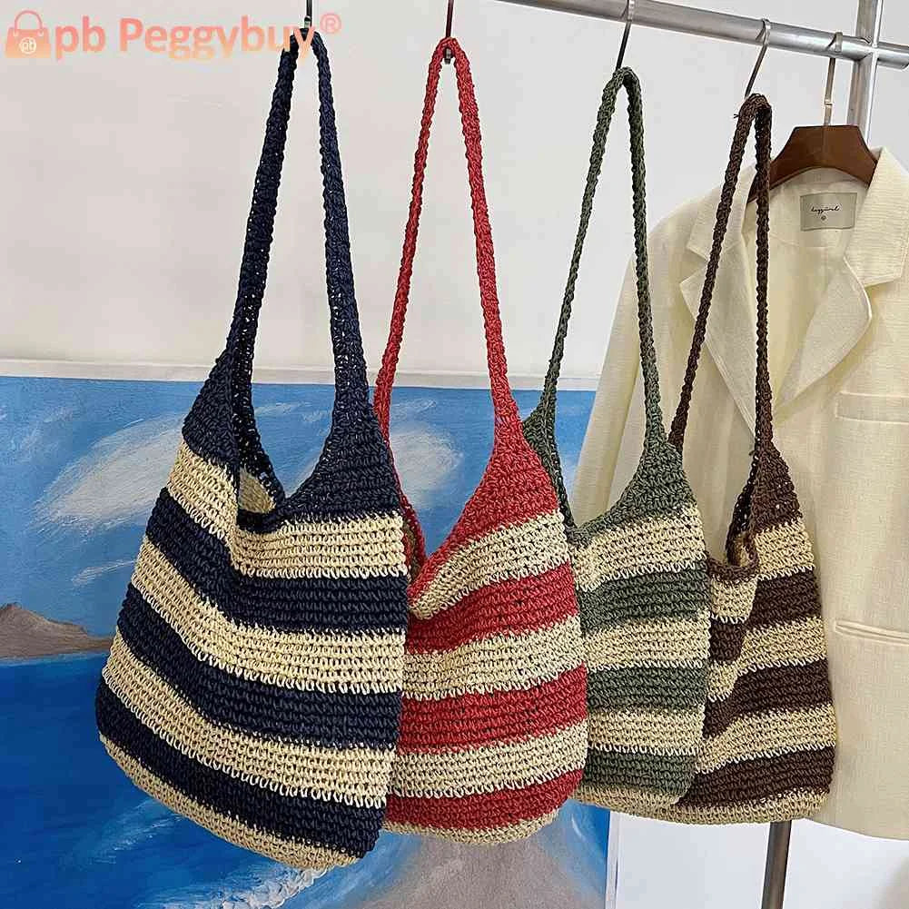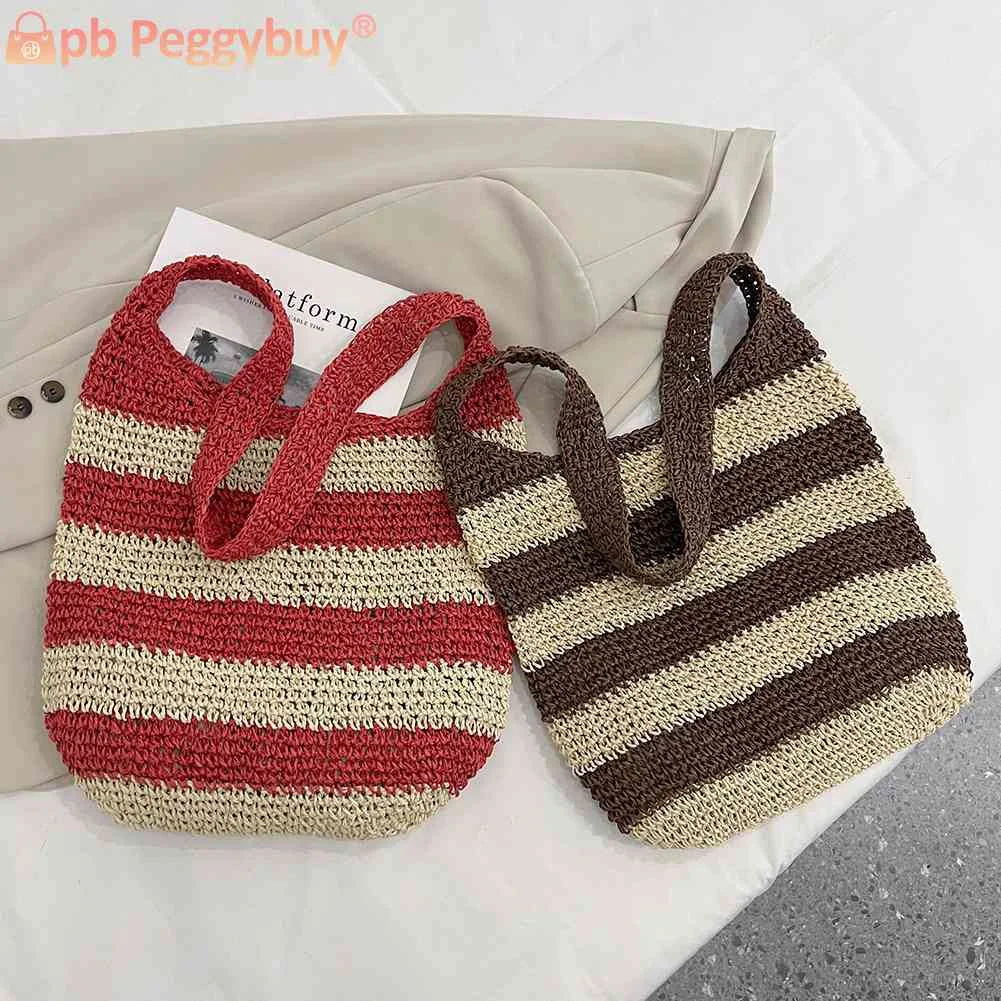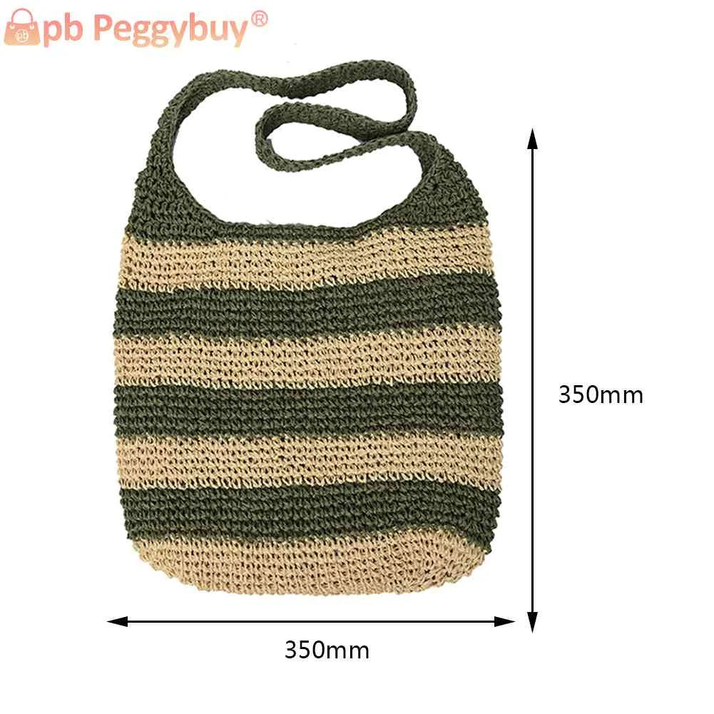 Women Messenger Bag Straw Weave Casual Travel Tote Hollow Striped Large Capacity