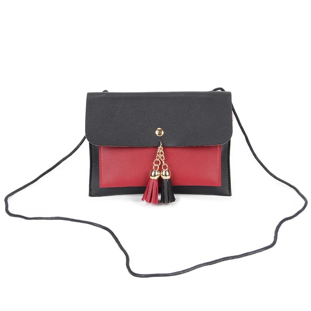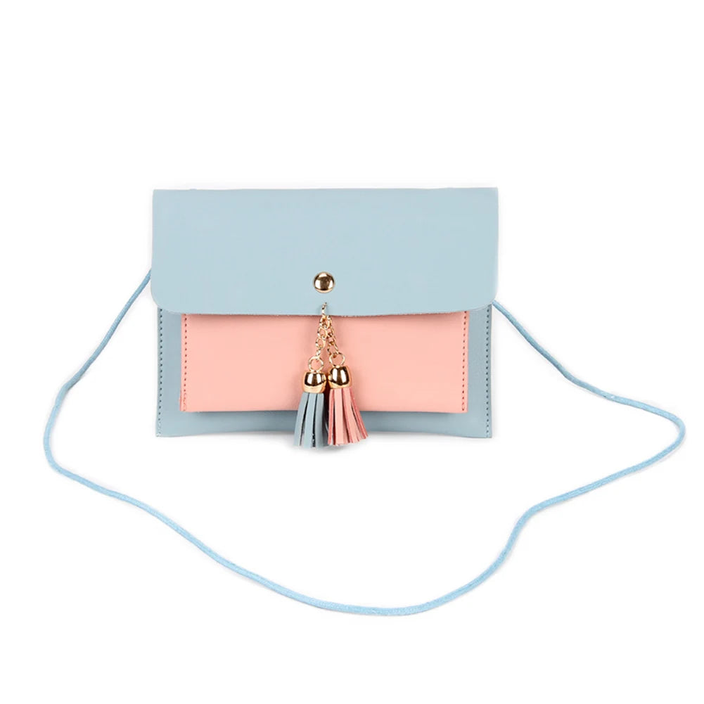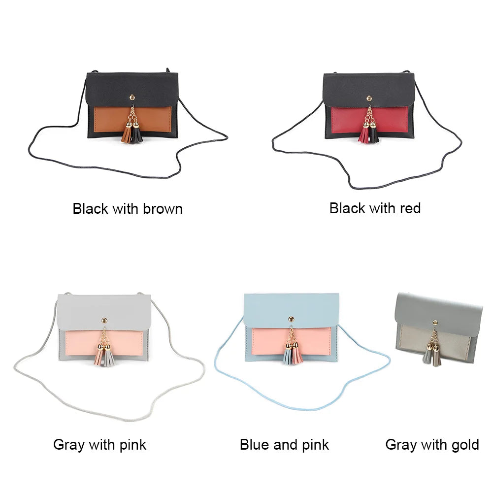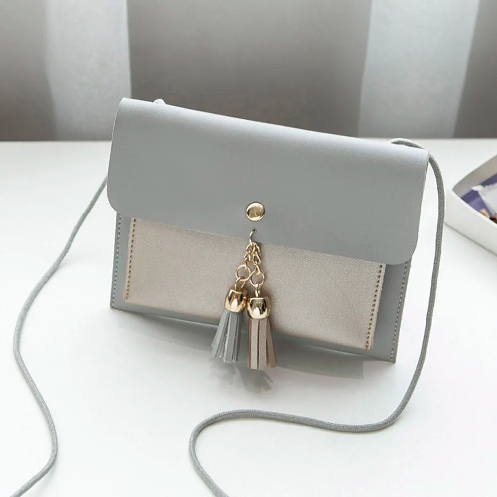 This mini crossbody bag is made of PU leather and features a tassel beach design. It has a hasp closure and is perfect for holding coins, phones, and money.