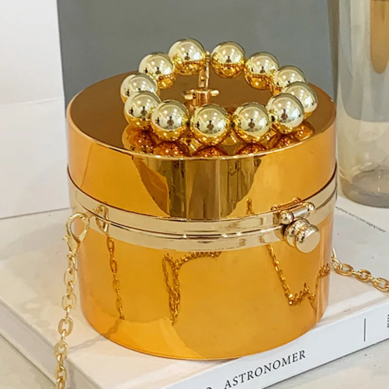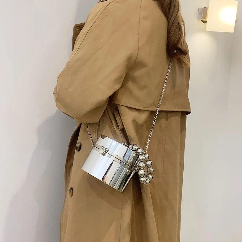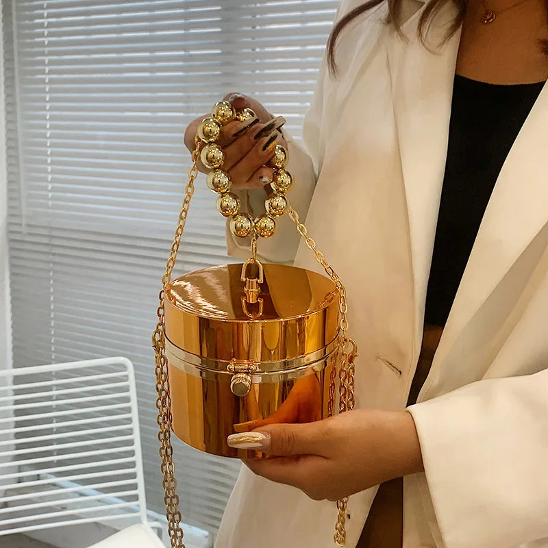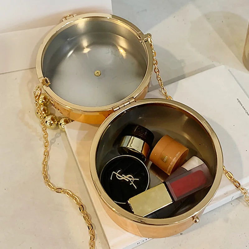 Elevate your style with this chic and trendy barrel-shaped clutch. Perfect for a night out at the club or a special event, this bag features a metallic finish and a fashionable acrylic design. The PVC chain adds a touch of edginess to your look, while the messenger style allows for easy carrying.