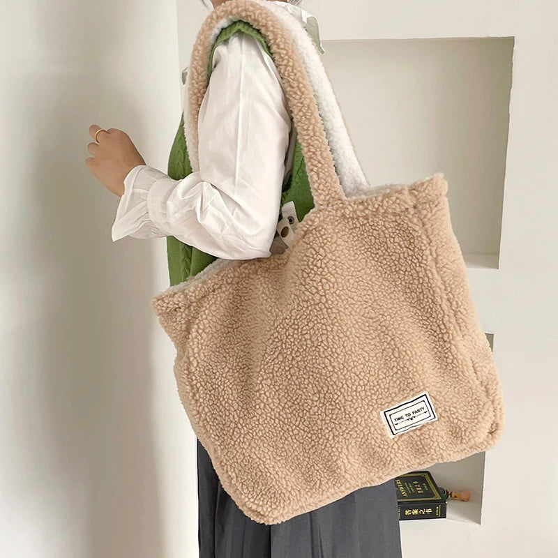 Women Plush Shoulder Bag Large Capacity Double Sided Lamb Like Fabric Shopper
