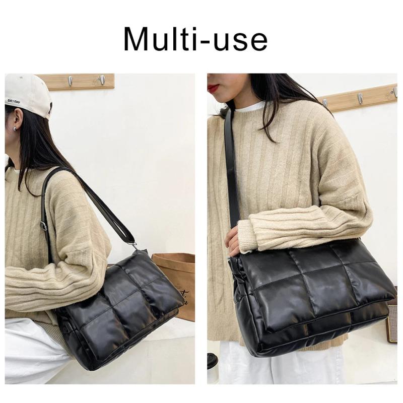 Stay stylish and warm this winter with this quilted crossbody bag featuring a soft and fluffy space pad design. Perfect for any female fashion enthusiast.