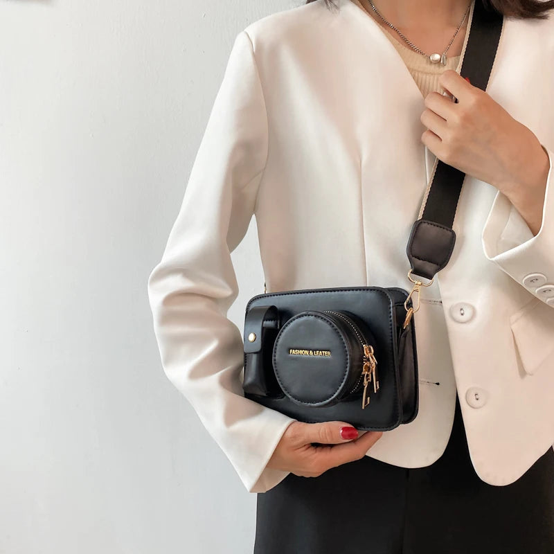 This stylish shoulder bag features a camera shape design and is made of high-quality PU leather. It comes with wide straps for comfortable wear and can be worn as a crossbody bag. Perfect for everyday use.