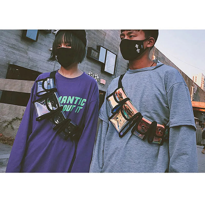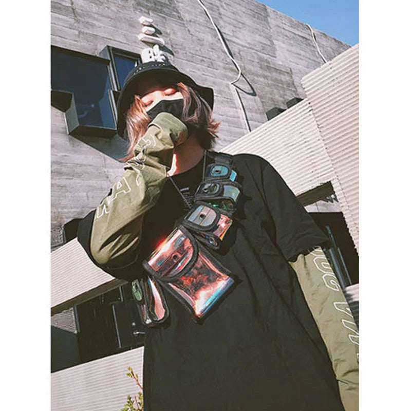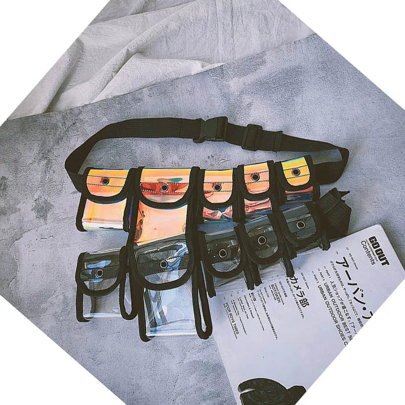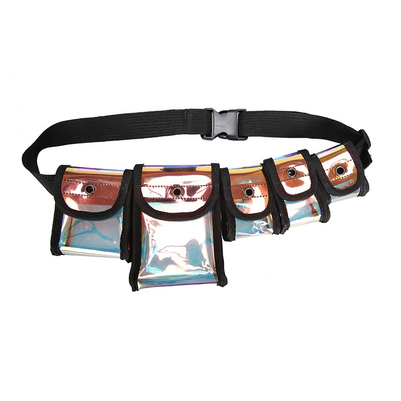 This women's tactical waist bag features a geometric design with a laser finish. It is perfect for carrying essentials in style.