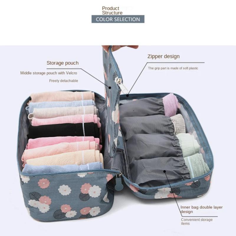 Keep your lingerie organized while traveling with this portable bra storage bag. Made of waterproof material, it can hold neckties, socks, panties, and more.