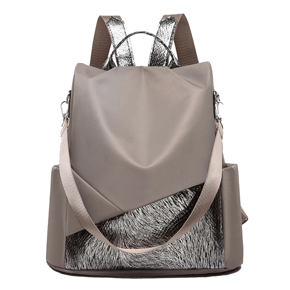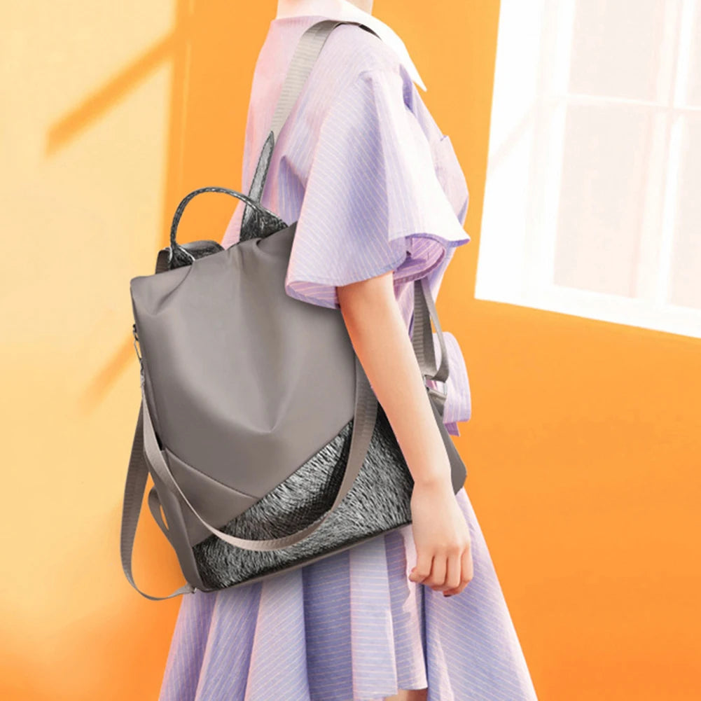 This stylish backpack is perfect for women on the go. It features a patchwork design and anti-theft features, making it ideal for school or travel. The adjustable shoulder straps provide comfort while carrying.