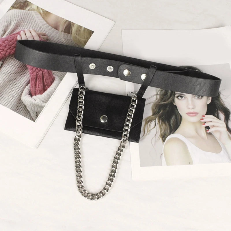 Stay stylish and hands-free with this women's decoration waist belt bag. Made of PU leather, it features a metallic chain for added flair. Perfect for carrying your phone and small essentials.