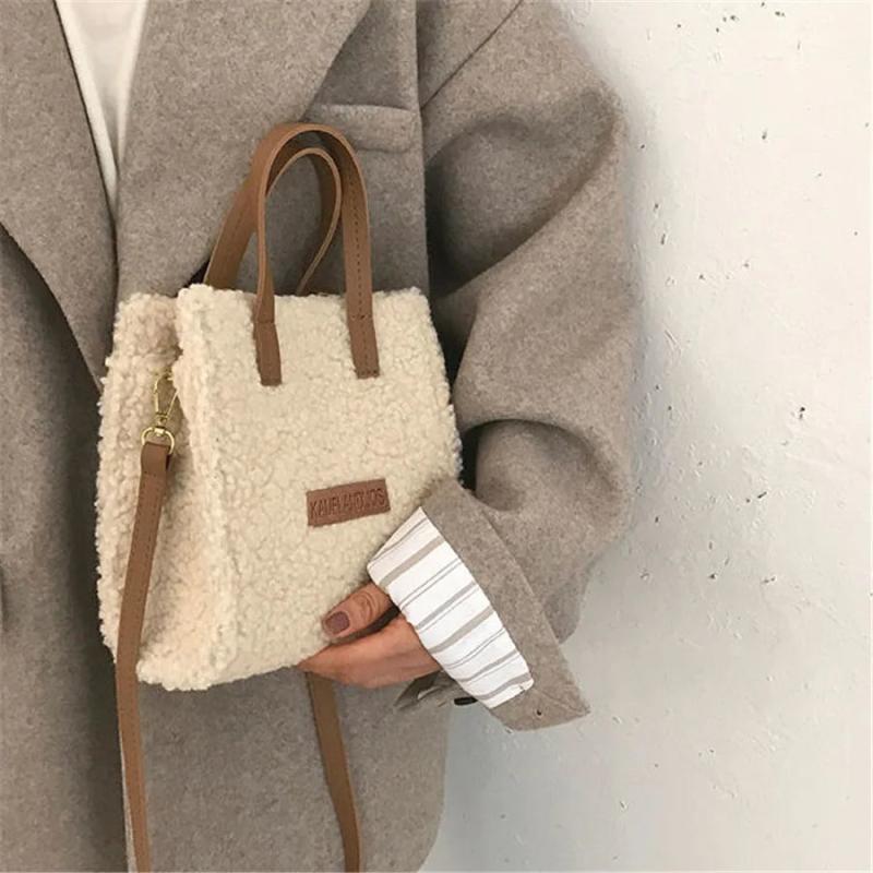 Women Winter Shoulder Bag Lamb Wool Warm Soft Autumn Ins Square Cross-body Beige