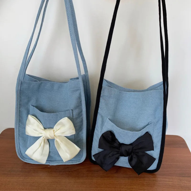Women's Bow Canvas Shopper Bag French Bow Denim Shoulder Bag Large Capacity