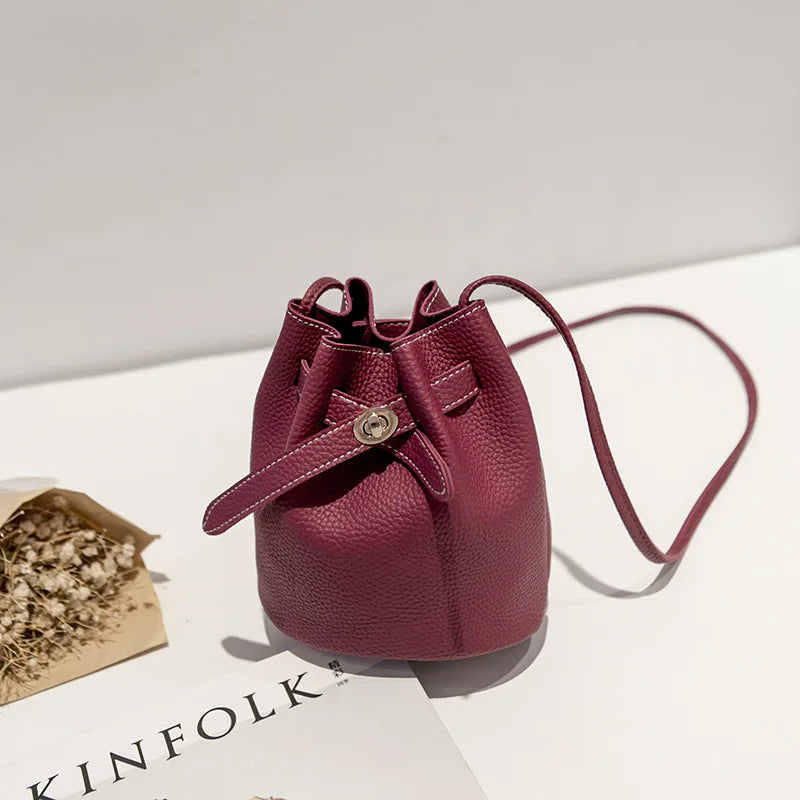 This stylish bucket shoulder bag is made of high-quality PU leather. It features a hasp closure and can be used as a crossbody bag. Perfect for young women looking for a chic and affordable accessory.