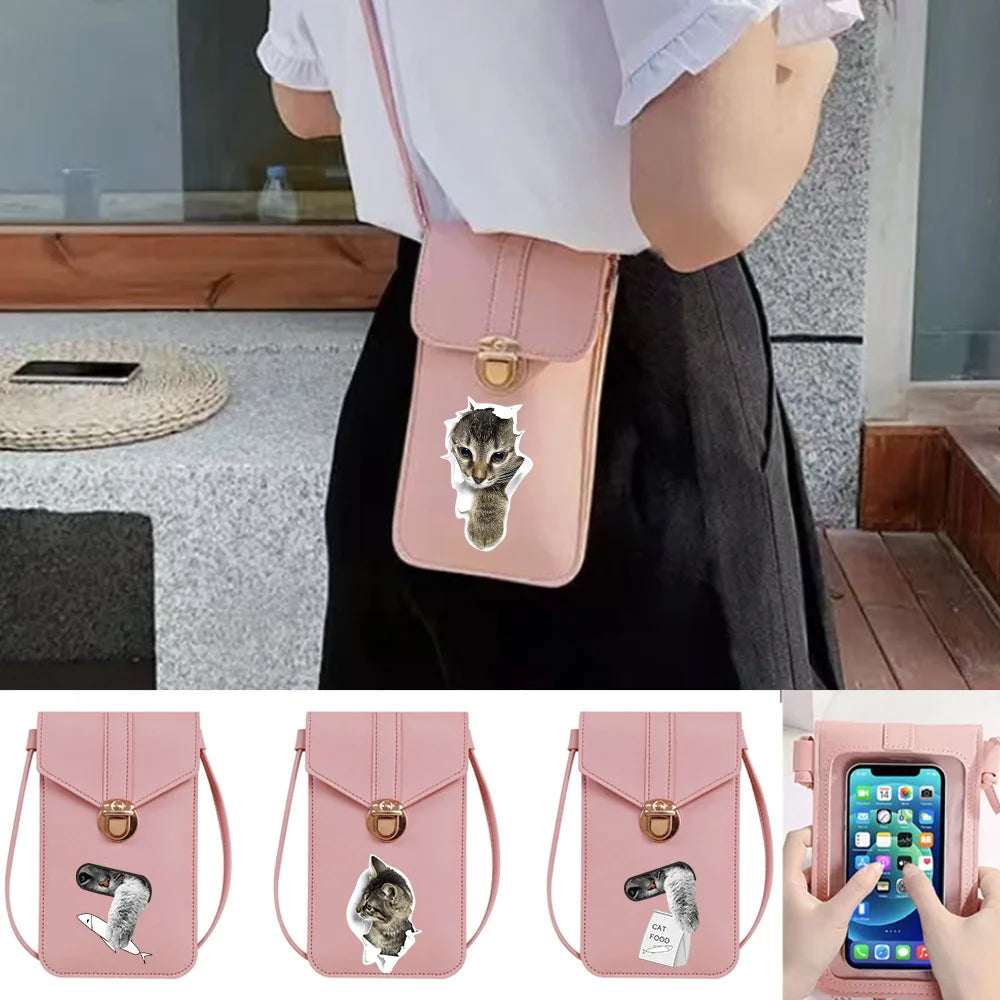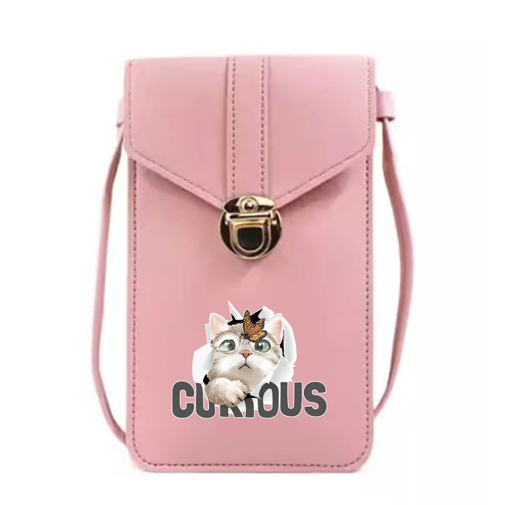 Stay organized and stylish with this PU leather phone bag featuring a cute cat print. It includes a touch screen compartment for your cell phone, multiple card slots, and a coin pocket.