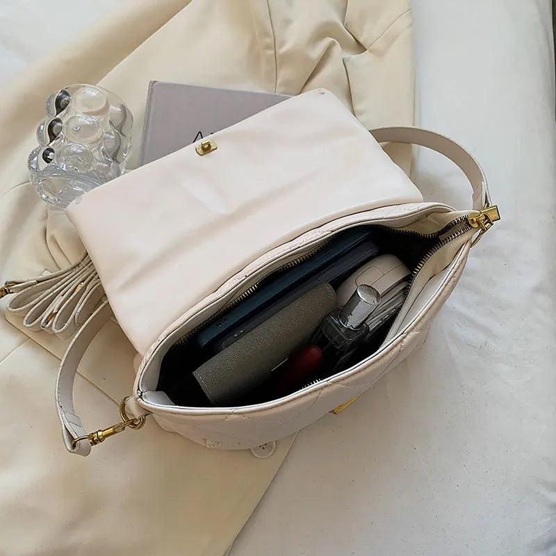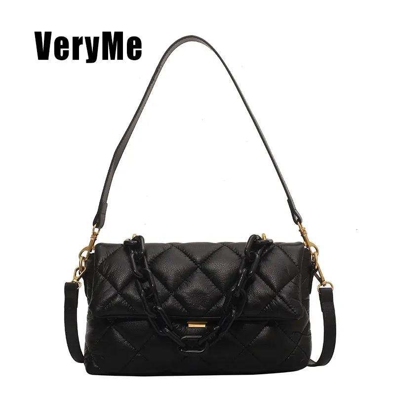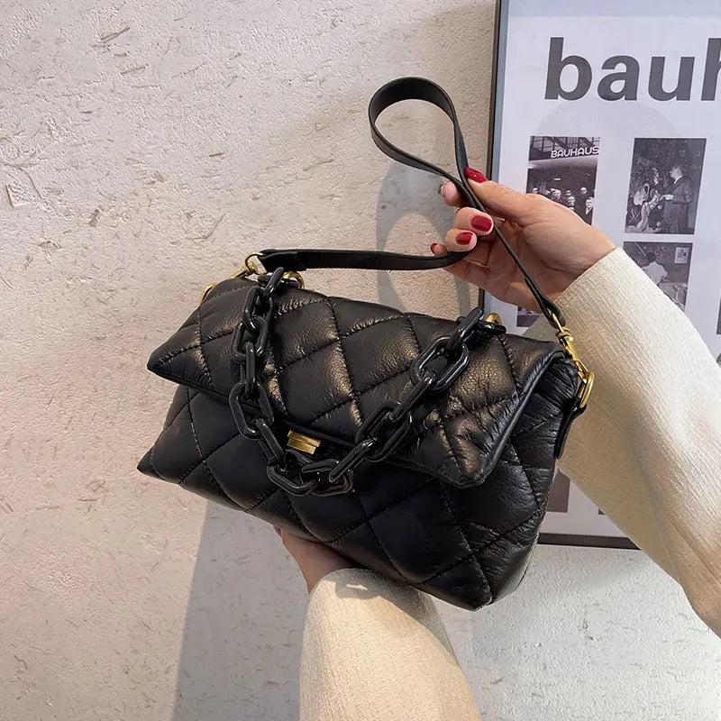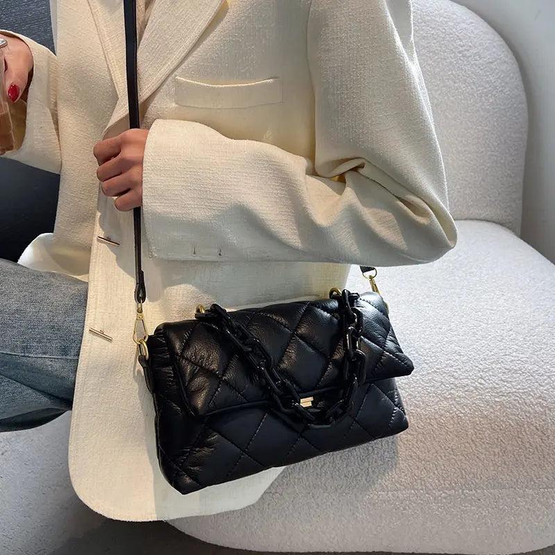 This stylish messenger bag is made of high-quality PU leather, featuring a chain strap for a trendy look. It is perfect for carrying your essentials in style.