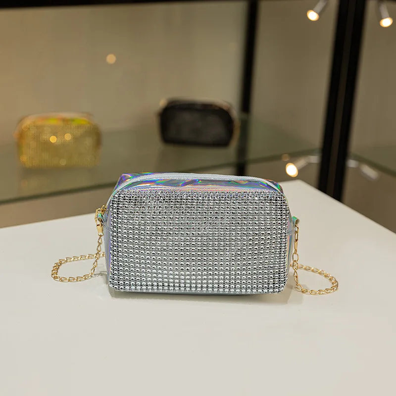 Women's Cosmetic Bag Chain Messenger Crossbody Bag Small Square Shining Diamond