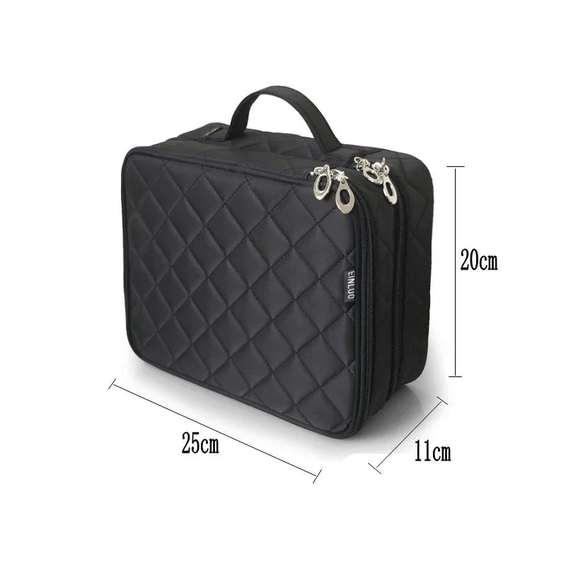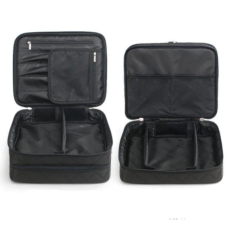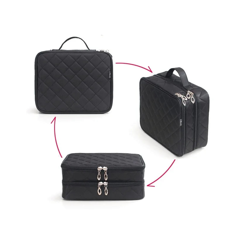 This double-layer makeup bag is perfect for storing and organizing your cosmetics while traveling. It offers ample space and convenient compartments.