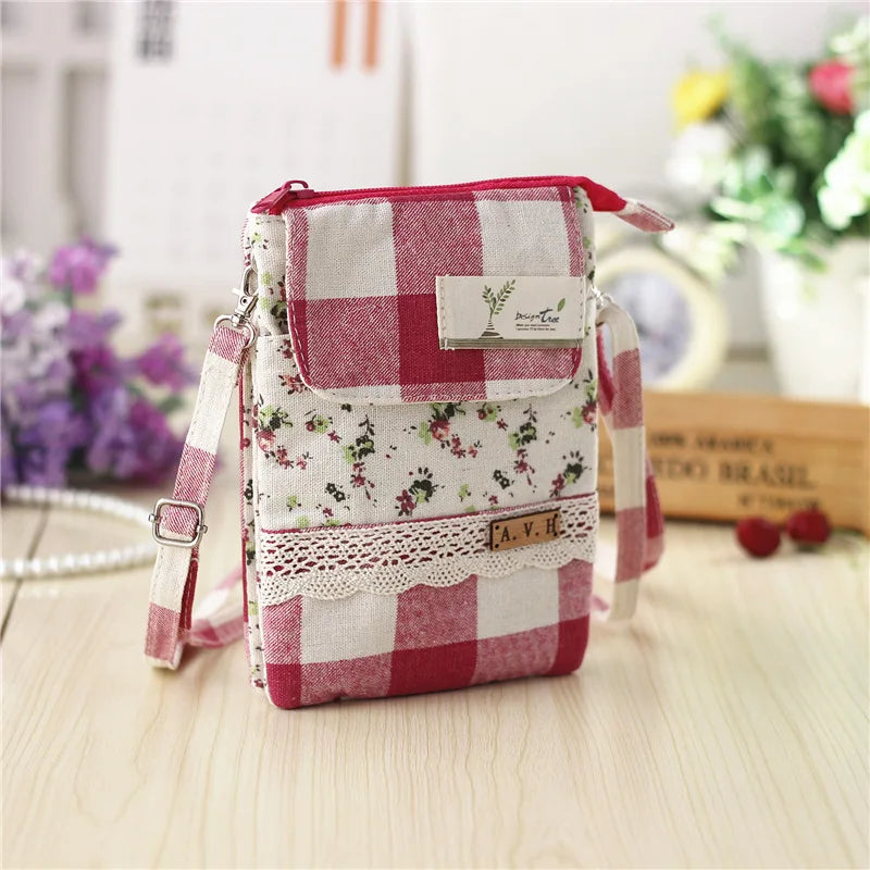 Women's Cotton Wallets Floral Plaid Phone Purses Coin Pouches Shoulder Bags