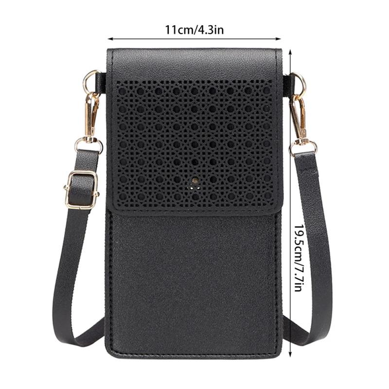 Stay stylish and organized with this PU leather crossbody phone bag that features a touch screen window for easy phone access. Perfect for on-the-go use.