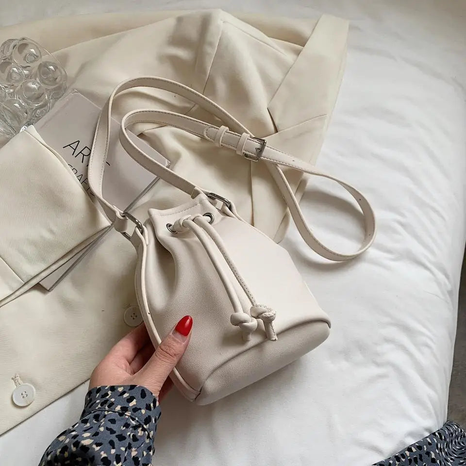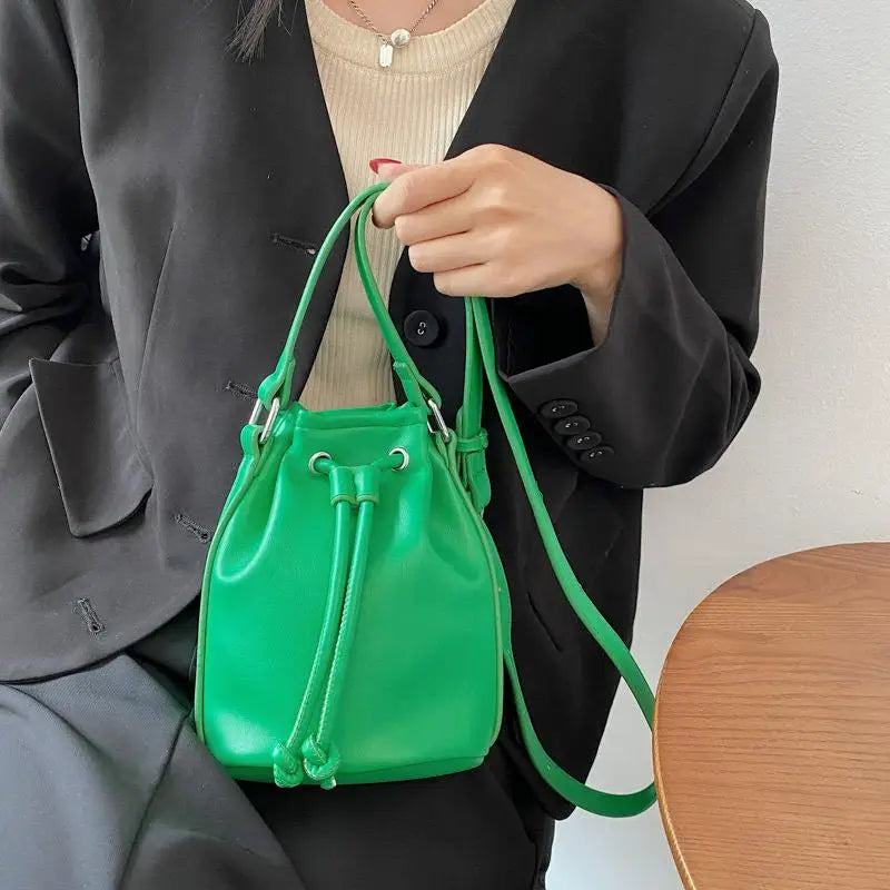 This women's drawstring bag is a perfect accessory for casual outings. It features a solid design with a mini bucket shape, adding a touch of elegance to your look.