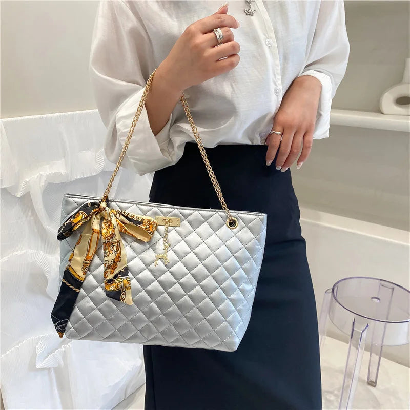 This women's tote bag features rhombus embroidery and a stylish design suitable for all occasions. It can be worn as a one-shoulder bag or with the chain strap.