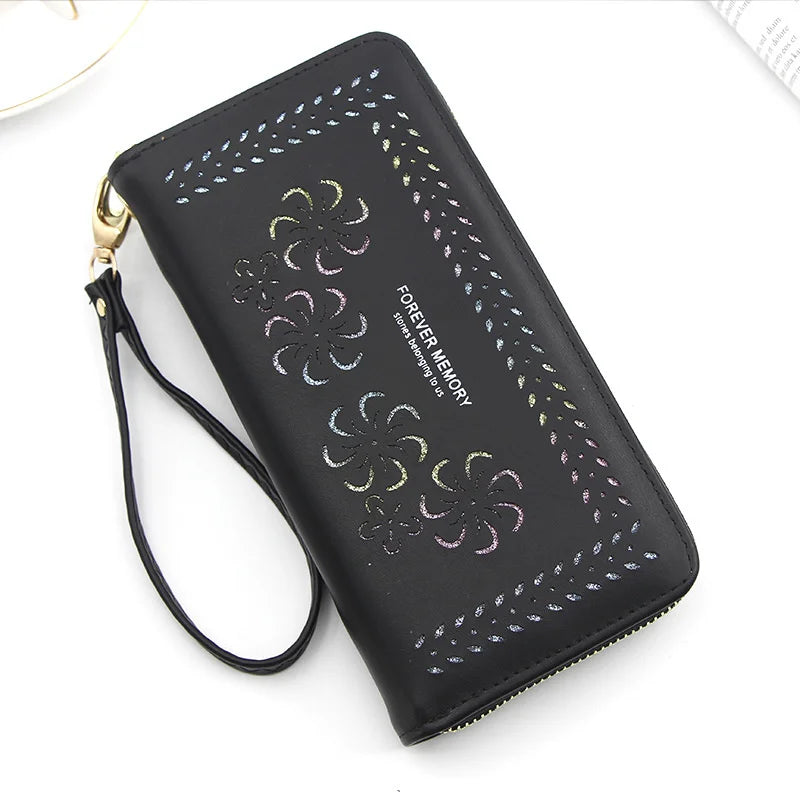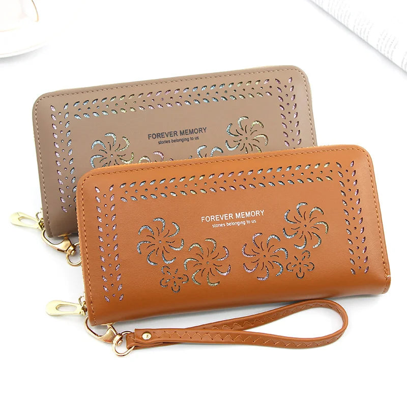 Women's Flower Hollow Wallet with Long Zipper Mobile Phone Bag