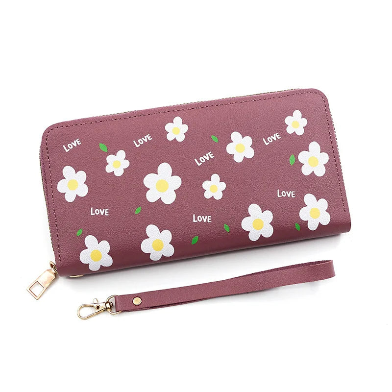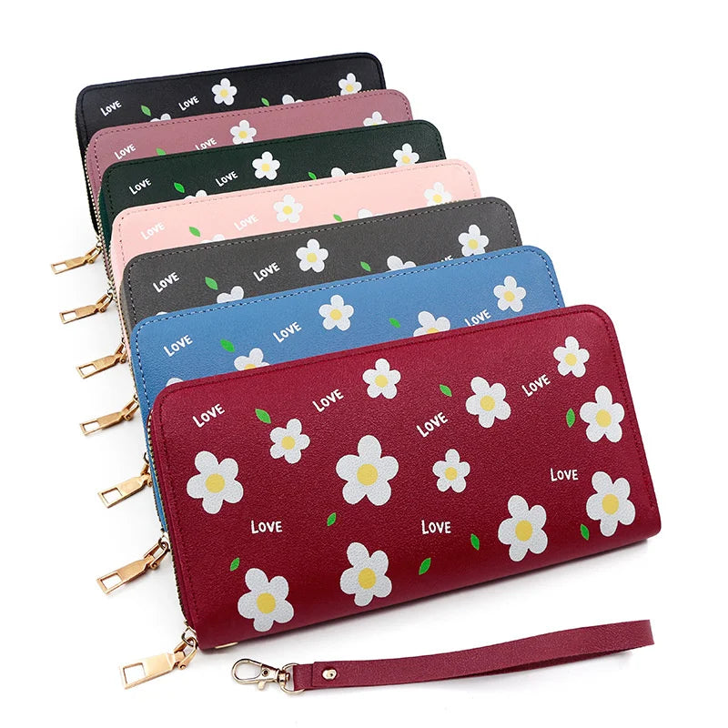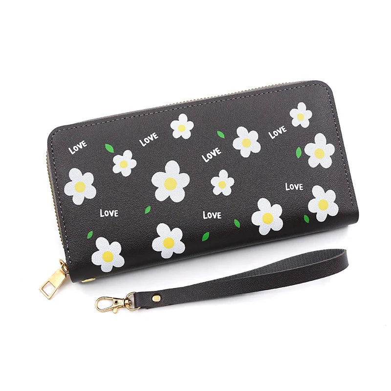 This women's long wallet features a beautiful flower print design, made of durable Pu material with a secure zipper closure. Perfect for storing your cash, cards, and coins in style.