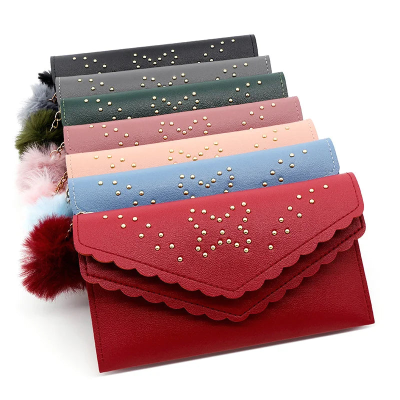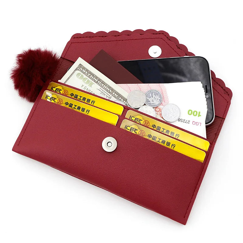 Stay stylish with this solid lace long wallet featuring a double cap design and wool ball detail. It has ample storage for cards, cash, and coins with a secure zipper closure.