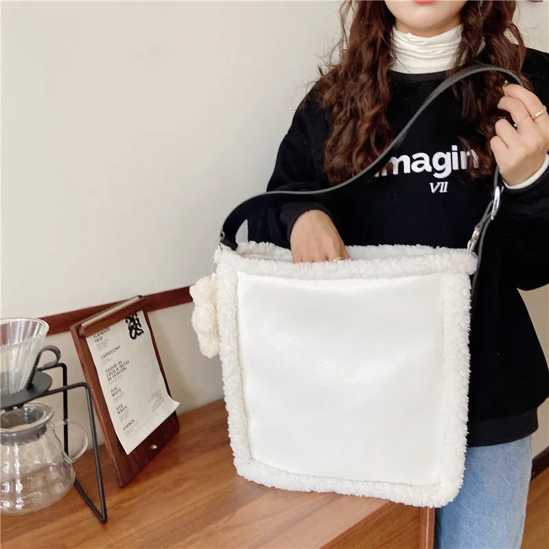 Women's Large-capacity PU Stitching Lamb Hair-shoulder Diagonal Bag