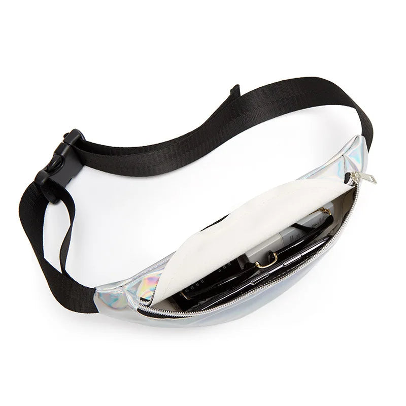 This stylish laser waist pack and shoulder bag is perfect for travel and sports activities. It features colorful laser design and a phone pouch for convenience.