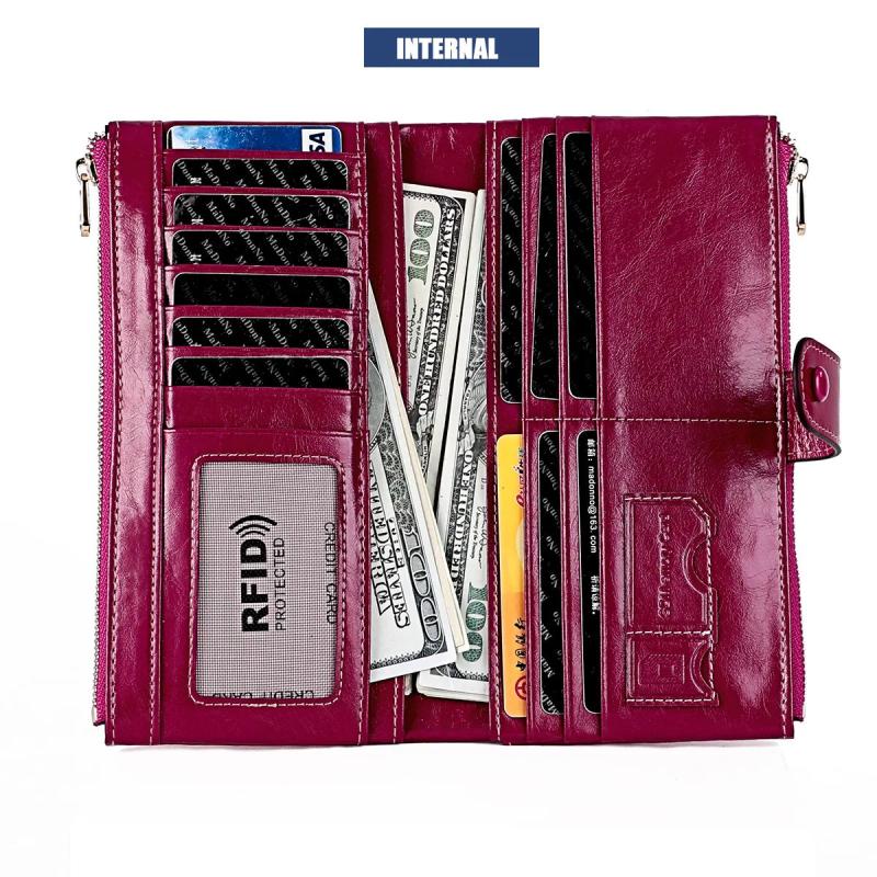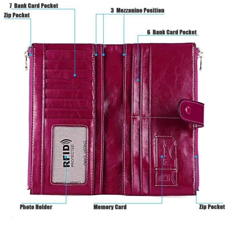 This women's wallet is made of high-quality oil wax leather, designed for durability and style. It features a spacious interior with multiple compartments for cards, cash, and coins.