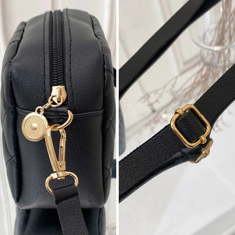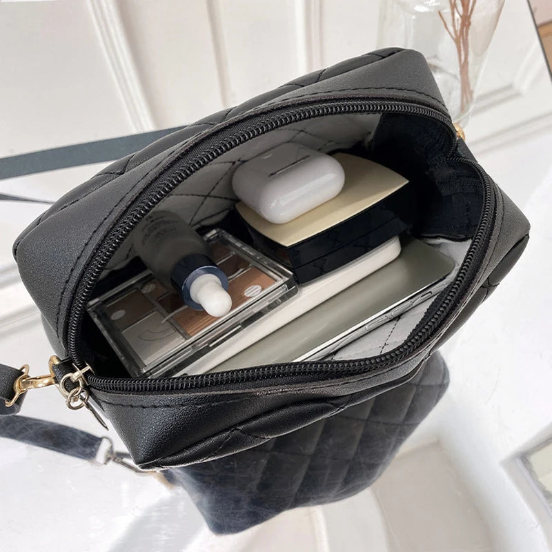 Trendy small messenger bag with rhombus embroidery design, perfect for women. This bag features a chain strap and is ideal for carrying a camera or other essentials.