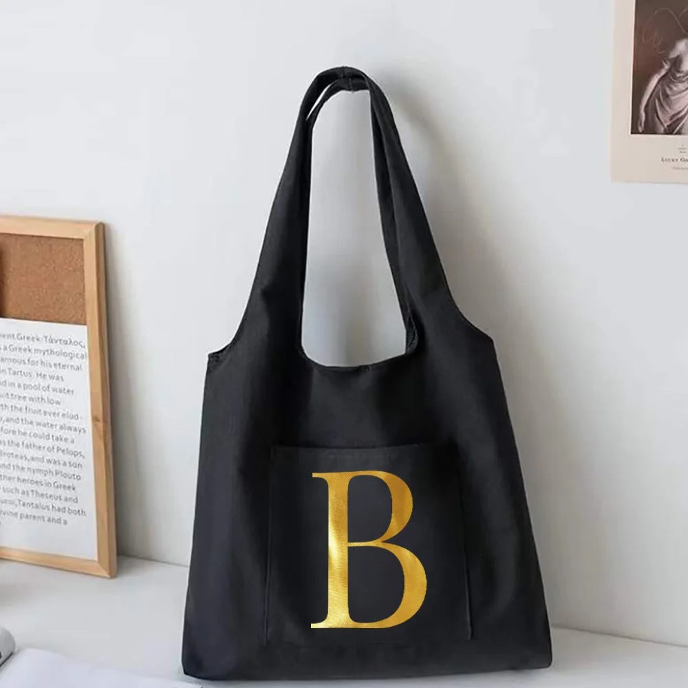 This versatile tote bag is perfect for daily use, shopping, or school. Made of durable canvas material with a stylish letter design.