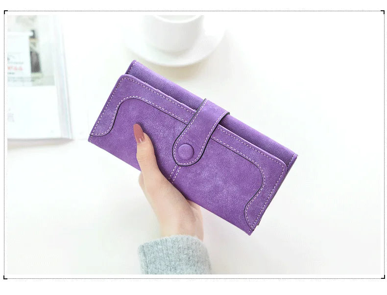 This women's wallet offers a multi-functional design with a large capacity to hold cards, cash, and a mobile phone. It features a stylish frosted finish and a convenient buckle closure.
