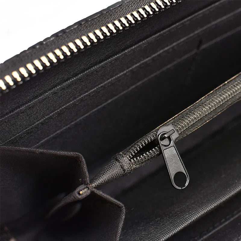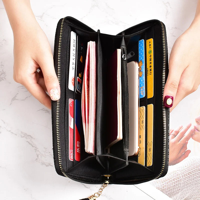 This large capacity wallet handbag is perfect for carrying all your essentials. It features a stylish woven design with a tassel zipper closure.
