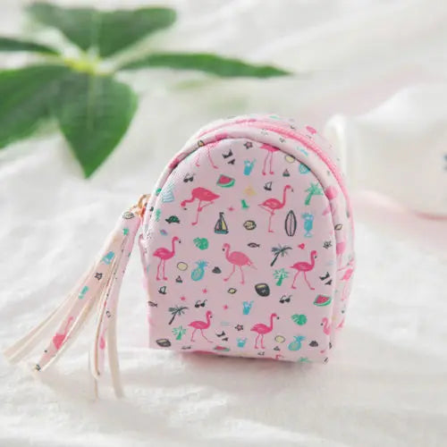 This mini coin purse features a stylish pattern with stripe, lattice, and dot printing. It has a convenient zipper closure and tassel for added flair.
