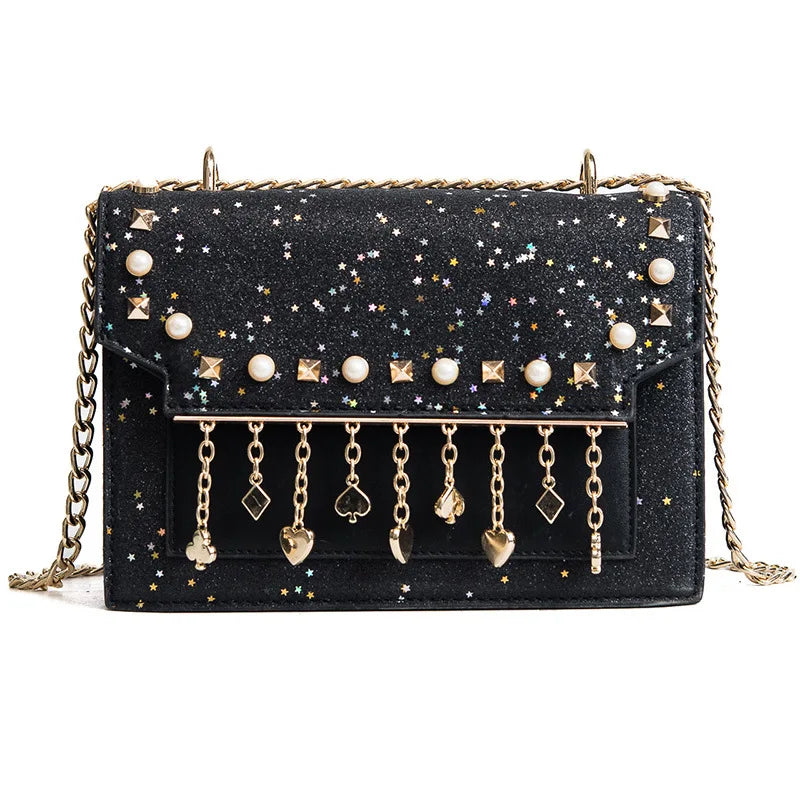 This small shoulder bag is perfect for casual outings. Featuring pearl and sequin embellishments, it adds a touch of elegance to your look. Made of high-quality leather, this bag is durable and stylish.