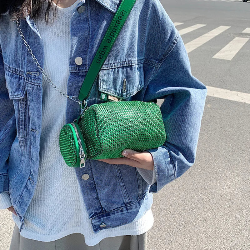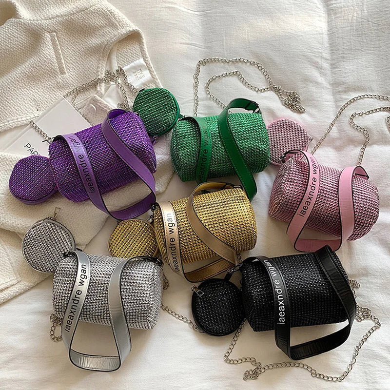 Elegant single shoulder bag featuring rhinestones with a luxurious texture. Includes a spacious main compartment, a woven design, and a mini pouch for extra storage.