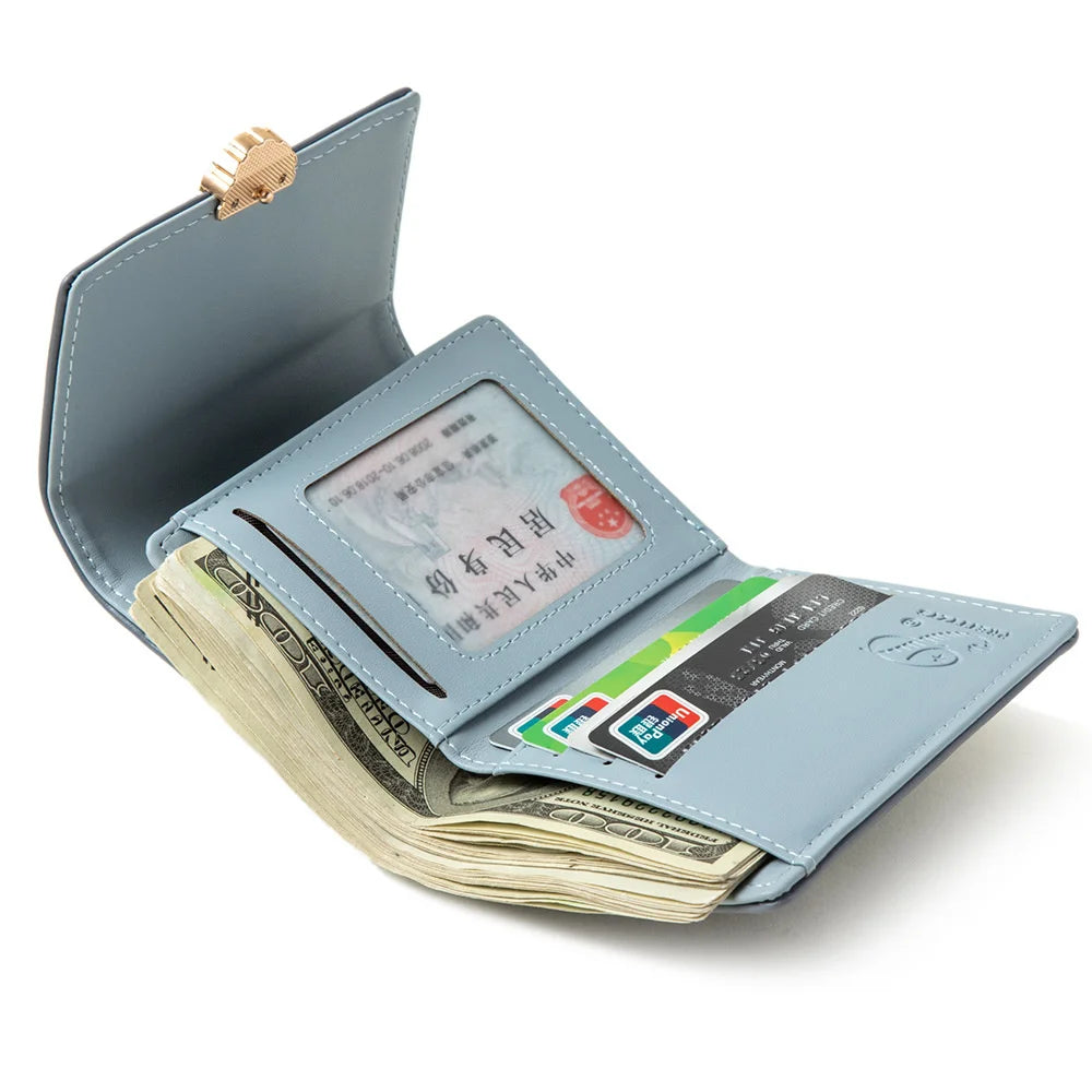This women's wallet features a cute bow buckle design with a zipper closure. It is perfect for holding cards, cash, and coins in a compact three-fold style.